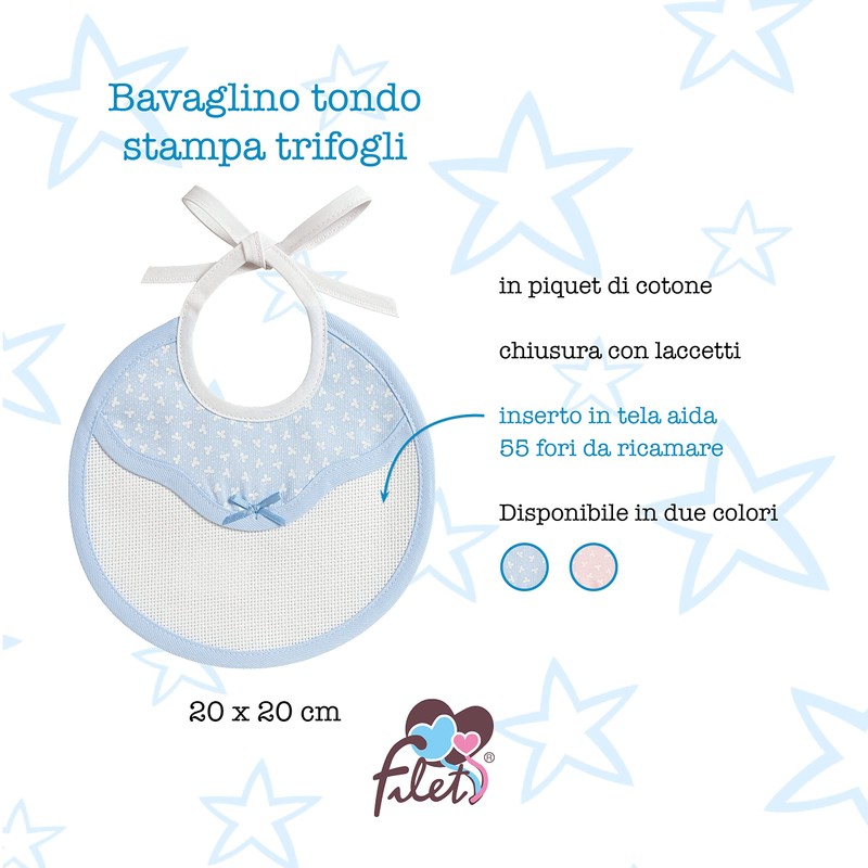 Filet - Round bib, practical accessory for your baby and easy to embroider, colourful cotton bib with white Aida insert with 55 holes, 100% made in Italy, lightblue