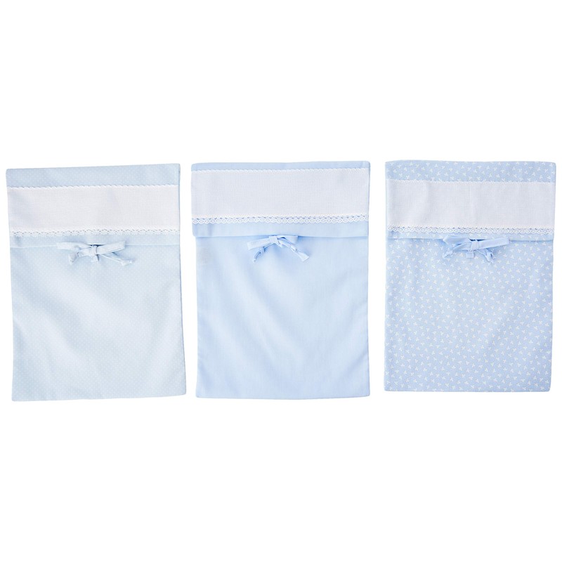 - Features: the three changing bags to be embroidered are made of light blue cotton piqué (1 plain, 1 with polka dot print, 1 with clover print). All three bags are 23 x 31 cm and are closed with a flap and two matching straps. Each bag has a 5.5 cm high Aida ribbon which is ideal for cross stitching the newborn's name or some fun motifs complemented in the lower part with a simple and refined lace