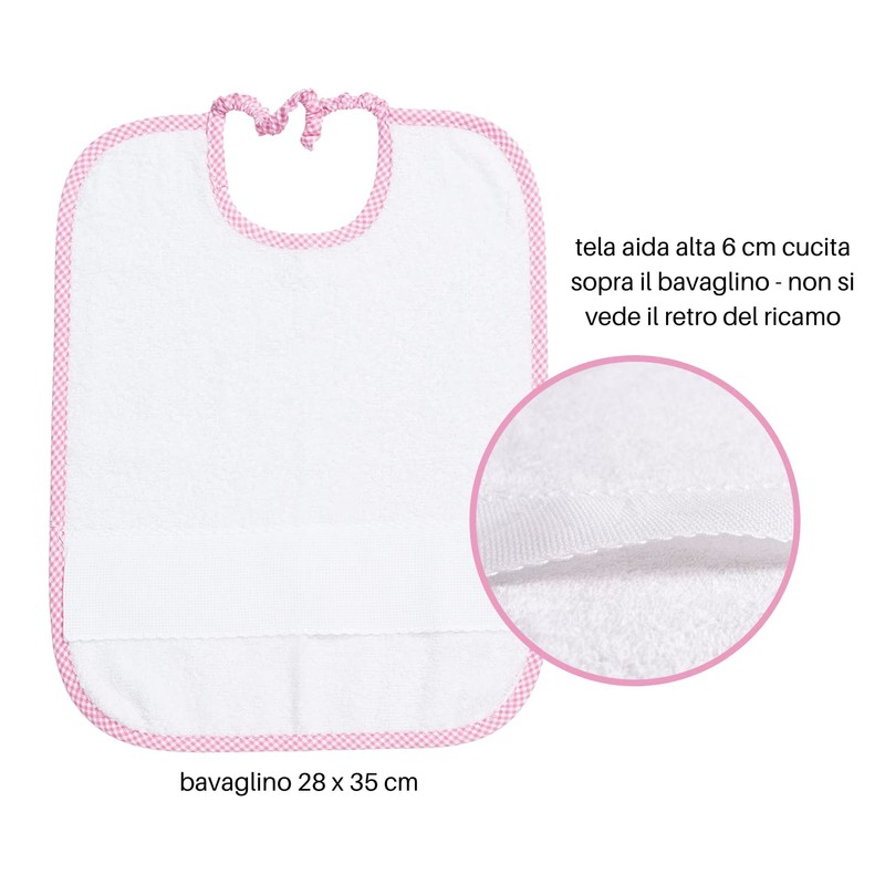 • Contents: At home, you will receive three bibs made of soft and absorbent terry cotton, with Aida fabric band for embroidery, 6 cm high, applied to the bib. The closure with the elastic band on the neck promotes children's autonomy, in a short time they can easily put on and take off. Made and packaged in Italy.