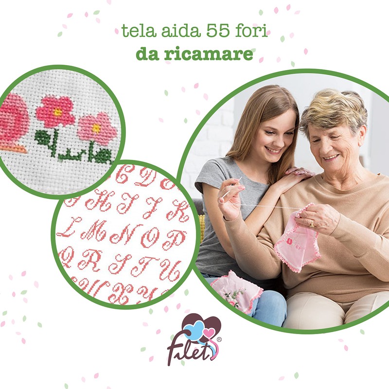 • 14 CT/55 hole Aida fabric insert: this fabric is the most commonly used embroidery fabric for cross stitches. Its precise binding forms a checkerboard pattern that allows you to guide the passage of the needle and easily get clean, regular crosses. The 55 hole Aida has 55 squares in 10 cm. This type of Aida is most commonly used by normal embroiderers, but is also ideal for those who want to try cross stitch for the first time