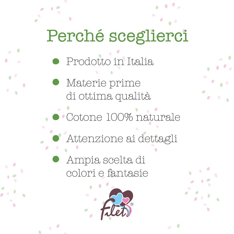 • Made in Italy – Our activity is based on the production and sale of baby and laundry accessories. We use high-quality raw materials from natural cotons. The design and production are fully implemented in Italy. Distinctive feature of fillet products are the inserts in canvas aid for embroidery, the use of piquets and quilted fabrics with a wide range of colours and patterns that always keep up with the new trends