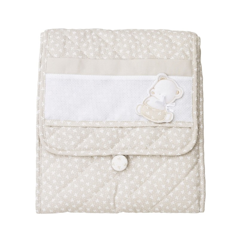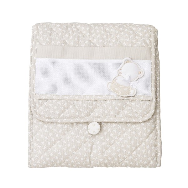 • Features: the travel changing mat is an indispensable accessory to wrap your newborn hygienically and safely. It is made of printed cotton on the outside (padded with polyester wadding) and cotton terry on the inside. When closed, the product measures 22 x 26 cm, when open, 42 x 82 cm; the bag made of Aida fabric to be embroidered on this changing mat measures 20 x 6 cm.
