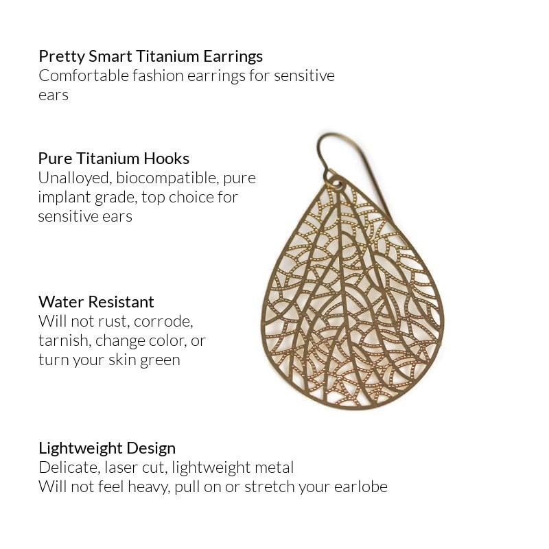 Comfortable, lightweight and hypoallergenic metal teardrop dangle earrings with leaf filigree cutout on titanium hooks for sensitive ears. Length : 2.2" ( 56 mm ) 1.18" ( 30mm) wide They will arrive in a hand stamped box ready for gift giving or for safe keeping.