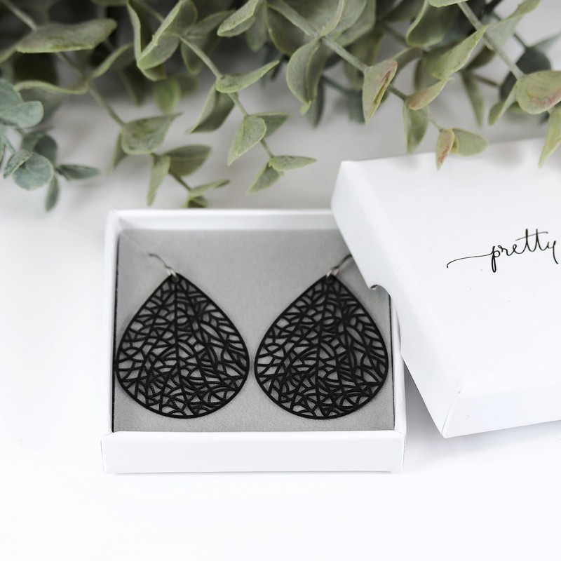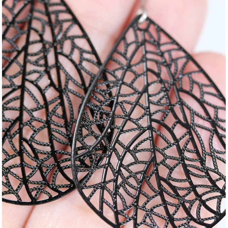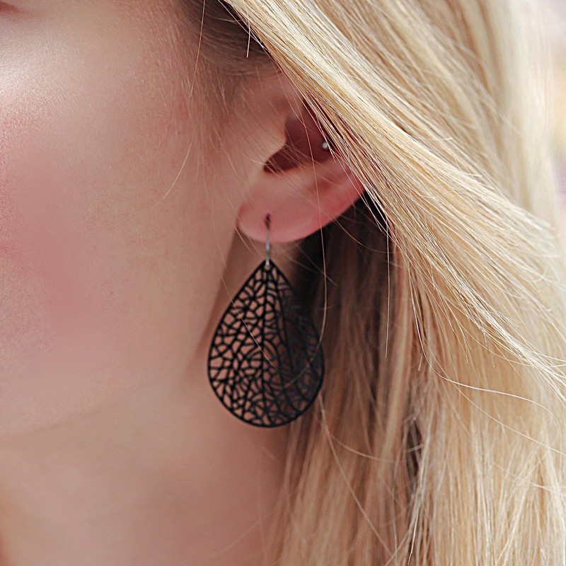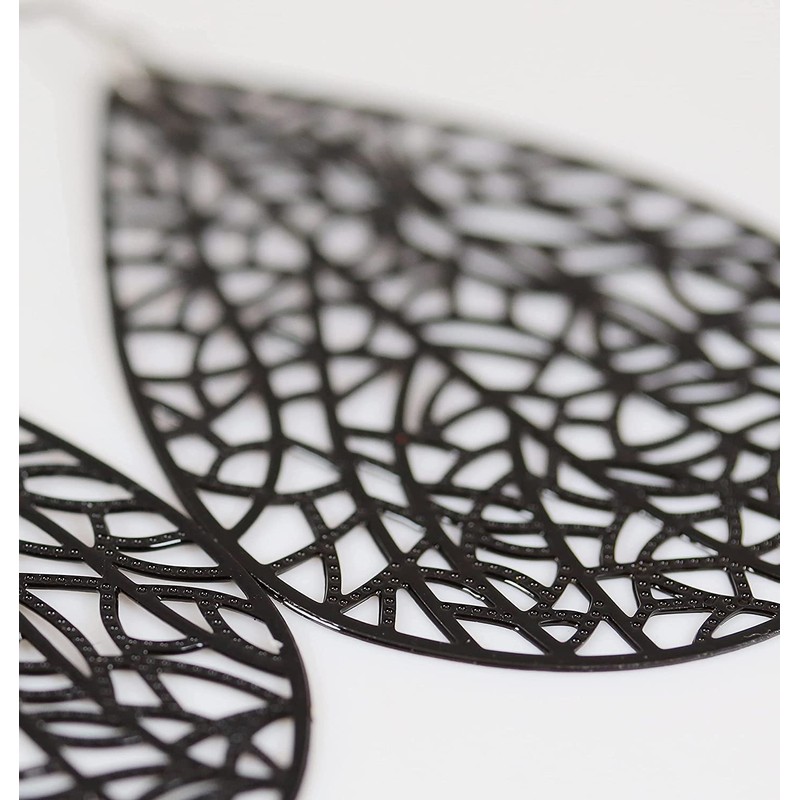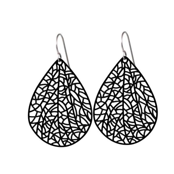 Filigree Dangle Earrings, Lightweight Teardrop Cutout on Hypoallergenic Pure Titanium Hooks (Black)