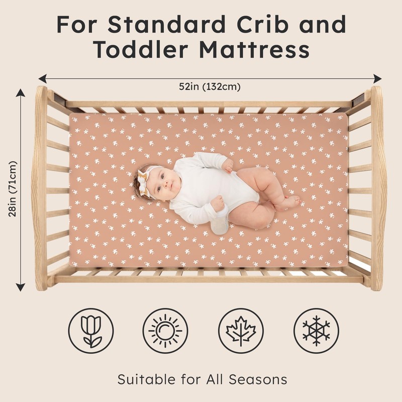 • Snug Fit and Secure - Our 52”X 28” baby crib sheets fit snugly to most standard crib and toddler bed mattresses, 8'' deep pocket has been tested and can securely wrap around the mattress corners and edges with 360 degree coverage,giving your baby a comfortable and safe bedding.