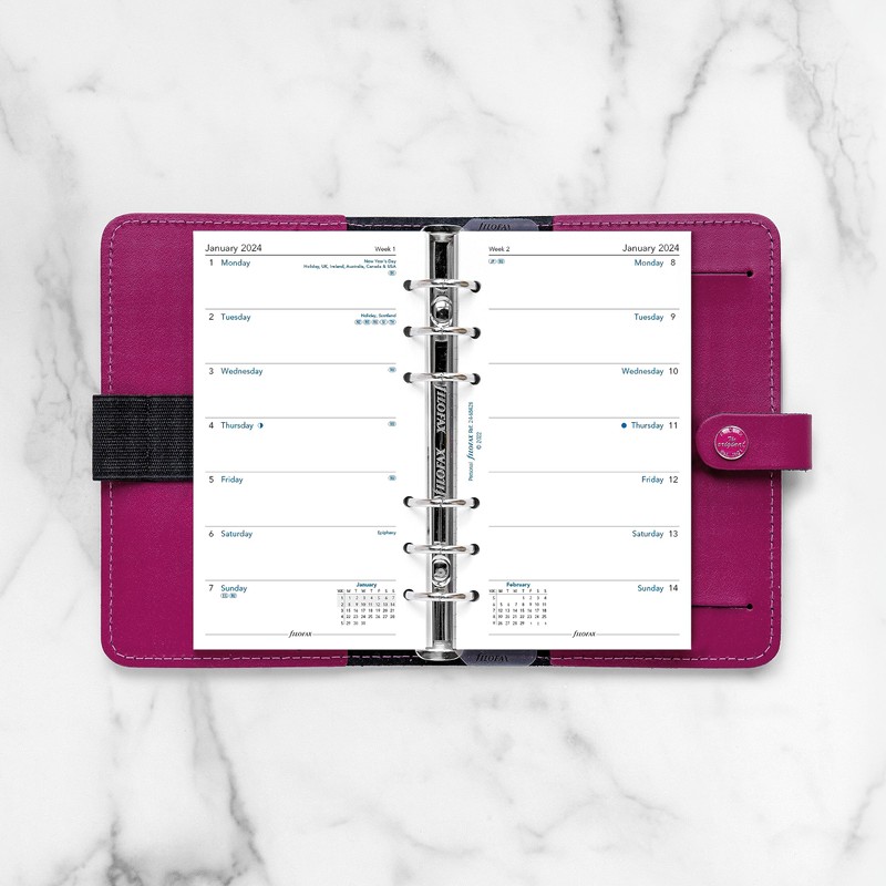 - Filofax Week on one page, two weeks per spread, January to December, 2024. Unruled, white paper. Weekly calendar diary dated refill for planners, organizers, agendas and diaries.