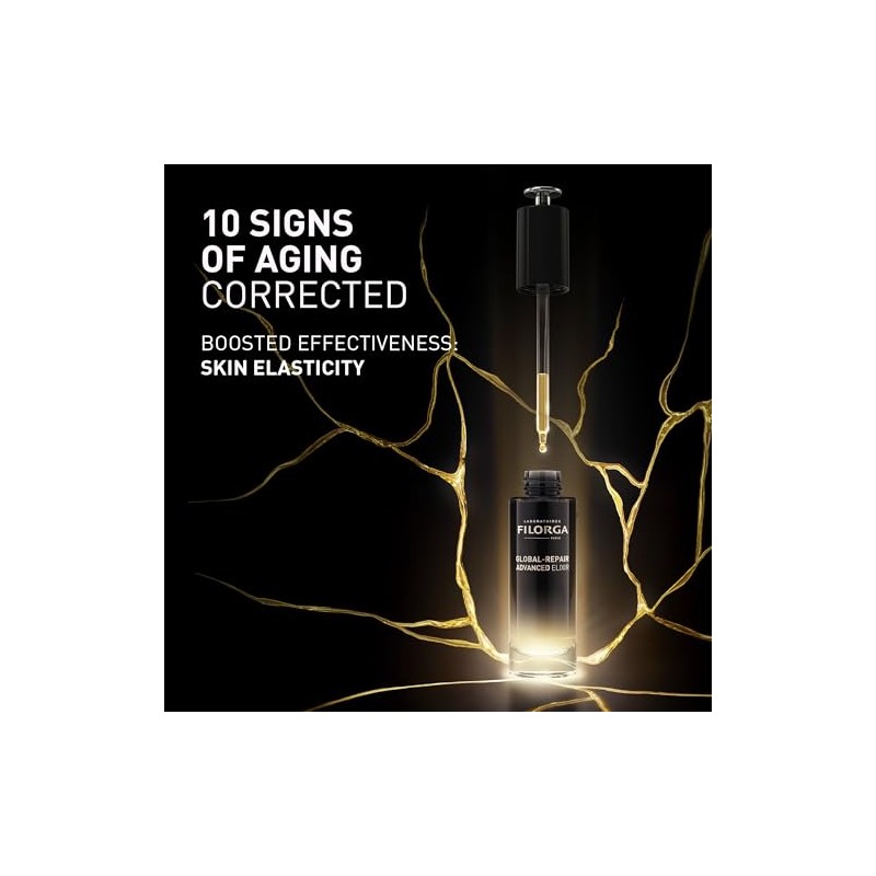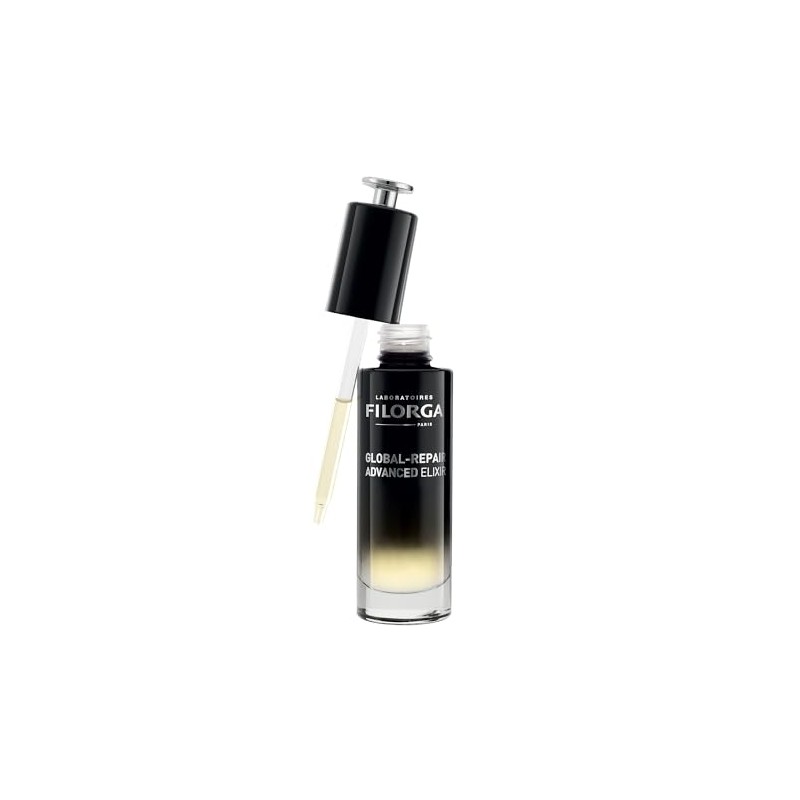 ? GLOBAL-REPAIR ADVANCED ELIXIR is an intensive youth serum with a light oil texture, which combines the effectiveness of advanced anti-ageing active ingredients with the nourishing power of precious oils to correct the 10 signs of ageing. ? The formula of this anti ageing serum is inspired by the lipid-rich dressings used in post-operative aesthetic medicine. The Laboratoires Filorga have developed a patented repair factor(1) which combines different lipids to encourage the skins natural repair process. This exceptional cosmetic product acts on the three levels of the skin [surface - structural - cellular] to combat the 10 signs of ageing: wrinkles - firmness - evenness - radiance - micro-relief - elasticity - nutrition - tone - density - redefined contours. The elixir is infused with essential oils such as Andiroba oil, which regenerates the epidermis and restores its elasticity, while Camellia oil, rich in omega 3,6 and 9, nourishes and illuminates the skin over time. ? Proven effectiveness in 7 days(2): 100% of women report a reduction in the feeling of tightness in their skin, 82% say their skin feels protected and their skin quality is improved. After 28 days: 83% of women report that signs of ageing appear reduced, and 91% say their skin looks more beautiful(3). ? Designed for all mature skin types, this youth serum with its fine, light oil texture penetrates the skin quickly, leaving a luminous, comfortable finish. ? GLOBAL-REPAIR ADVANCED ELIXIR can be used each morning and/or evening on the face and neck. Using the pipette, place 3 to 4 drops of serum in the palm of your hands, then warm the product. Smooth the product from the centre to the edges of the face. ? Formulated with 78% natural origin ingredients(4). Clinically proven effectiveness. Tested under dermatological control. (1) Patent no. xxxx (see patent numbers for each country) (2) Self-assessment - 34 volunteers - Results after 7 days of applying GLOBAL-REPAIR ADVANCED ELIXIR twice a day. (3) Self-assessment - 35 volunteers - Results after 28 days of applying GLOBAL-REPAIR ADVANCED ELIXIR twice a day. (4) Percentage calculated in accordance with ISO 16128.