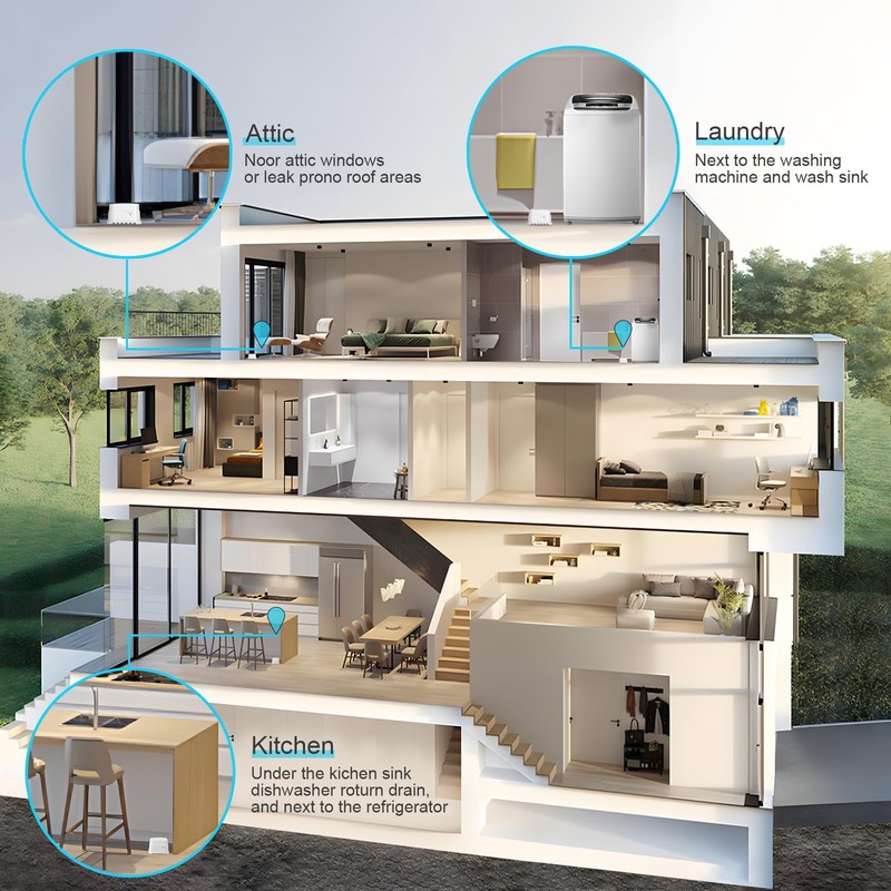 - Versatile Applications: Locate the detector through your mobile app in various areas, including sinks, dishwashers, appliances, refrigerators, washing machines, sump pumps, water heaters, hot tubs, water filtration units, and more.