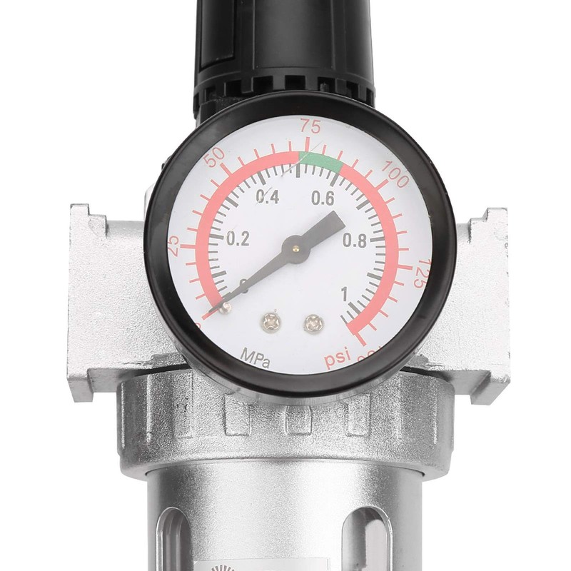 4. Pneumatic Air Filter Regulator Easily adjust the pressure control with the adjustable pressure control knob by pulling up and turning the black knob at the top of the regulator to adjust the desired pressure. Increase the accuracy of your work and optimize performance with this pneumatic air filter regulator.