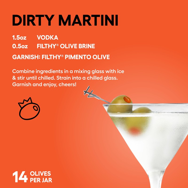 Filthy Pimento Stuffed Olives, Premium Cocktail Garnish, Spanish Pimento Pepper Stuffed Olives, Non-GMO, Gluten Free, Vegan, Naturally Cured Queen Olives Hand Stuffed in the USA, 8.5 Oz Jar, 14 Olives