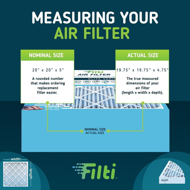 - EVERY AIR FILTER has nominal size and an actual size. The nominal size is rounded to the nearest whole or half inch, normally in larger font, that helps simplify the purchasing process (ex 20 x 20 x 5). Whereas the actual size is an exact measurement, normally in a smaller font, that depicts the precise dimensions of the filter (19 ?" x 19 ?" x 4 ?")
