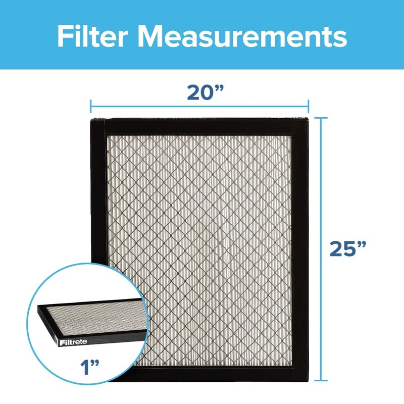 Filtrete 20x25x1 MPR 2800 Air Filter, made by 3M, helps capture unwanted particles from your household air to contribute to a cleaner, fresher home environment. Designed with exclusive Filtrete 3-in-1 technology, including a high MPR 2800 and MERV 14 rating, your AC filter will help pull and capture countless microparticles and ultrafine particles C such as pet dander, smoke, bacteria and viruses C while letting cleaner air flow through. This HVAC filter captures up to 81% of small particles (1) and 93% of airborne virus particles (2) to help make your air cleaner. Your Filtrete Filter will also capture large particles, including lint, pollen and household dust. This filter is CERTIFIED asthma and allergy-friendly (3). Use this 2-pack of 3-month pleated 1-inch home air filters in your furnace, air conditioner or HVAC system. Change your furnace filter at least every 90 days.(1) Percent captured is based on ASHRAE 52.2 testing for 0.3 to 1 micron particles from the air passing through the filter, which relates to HVAC industry standard efficiency testing.(2) Based on airborne M2 virus testing. Initial efficiency.(3) As outlined in report ASCR: 1246-01.(4) Based on the 2022 Ipsos US Brand Health Study of Residential HVAC Air Filters.