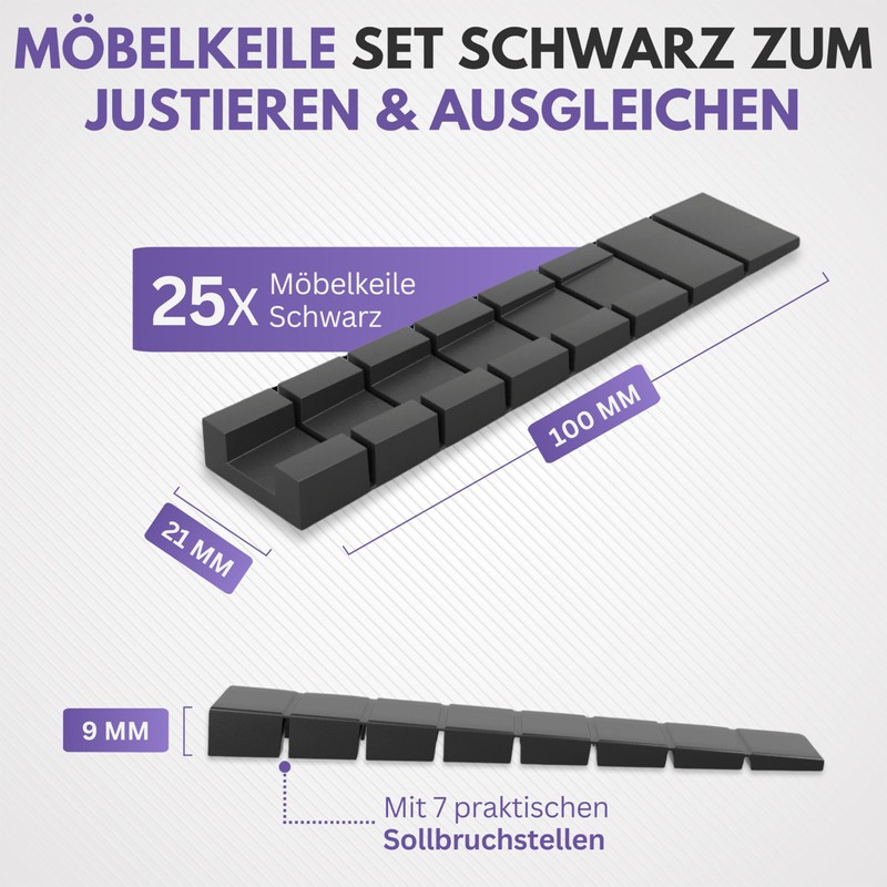 Filzada 25 x Furniture Wedges Black - 100 x 20 x 8 mm - Sturdy Plastic Wedges with Predetermined Breaking Points - Balancing Wedges - Plastic Wedges - Wheel Chocks Furniture