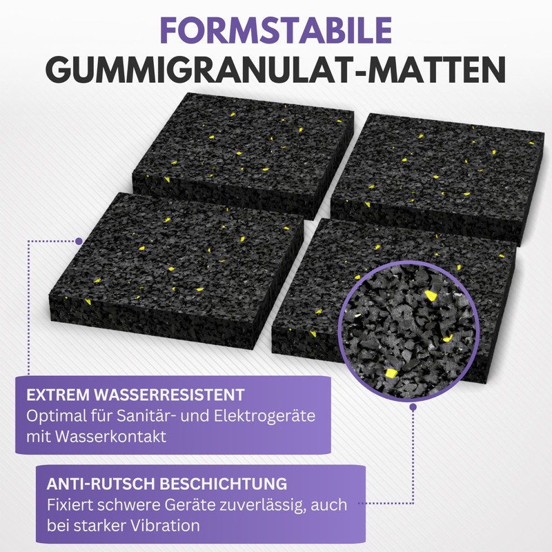 - Quality: our washing machine mat is made of rubber granules, which makes it a good choice. With a size of 90 x 90 mm and the extra thickness of 15 mm, the rubber mat washing machine is inconspicuous and at the same time effective.
