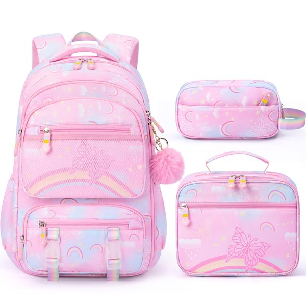 Fimibuke Kids Backpack for School Girls, 3PCS Rainbow & Butterflies Teen Girls Backpack with Lunch Box & Pencil Case, Pink Bookbag School Bag for Kindergarten Elementary Middle School Student Ages 5+