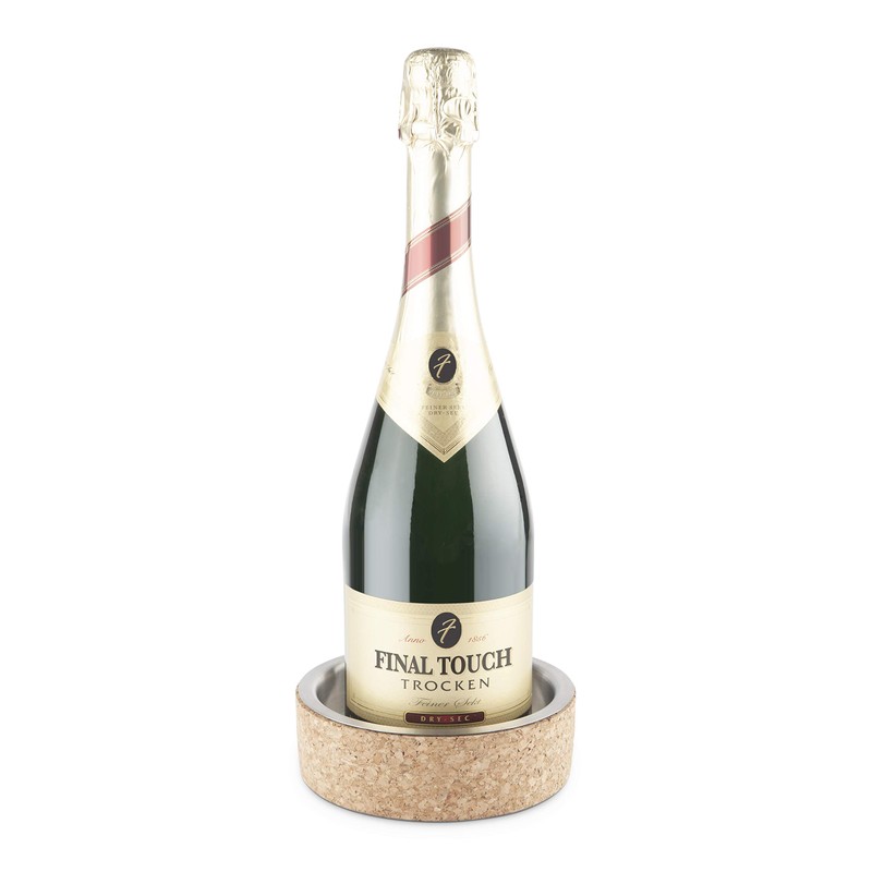 - Includes: Cork bottle coaster with stainless steel insert | Dimensions: 4.3 x 4.3 x 1.6 in (11 x 11 x 4 cm) | Capacity: Champagne & Magnum sized bottles ~ 10 cm (3 7/8") diameter | Material: Cork & Stainless Steel | Washing: Hand wash