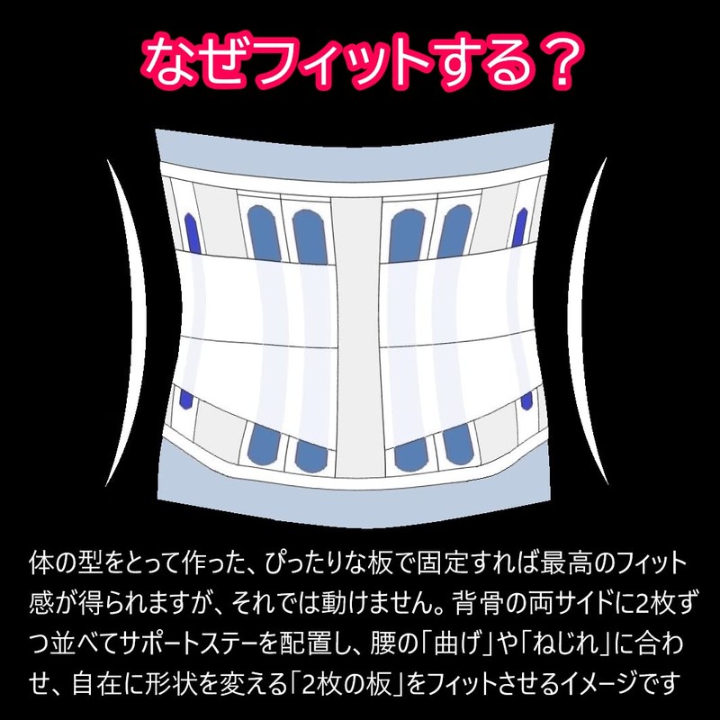 The structure reduces the tightness of the stomach when bending forward. 4 ABS support stays, which are installed to hold the spine from both sides to secure the waist area. Furthermore, two soft bones on the outside support the twisting action. 6 total support stays provide excellent support for your lower back movement.