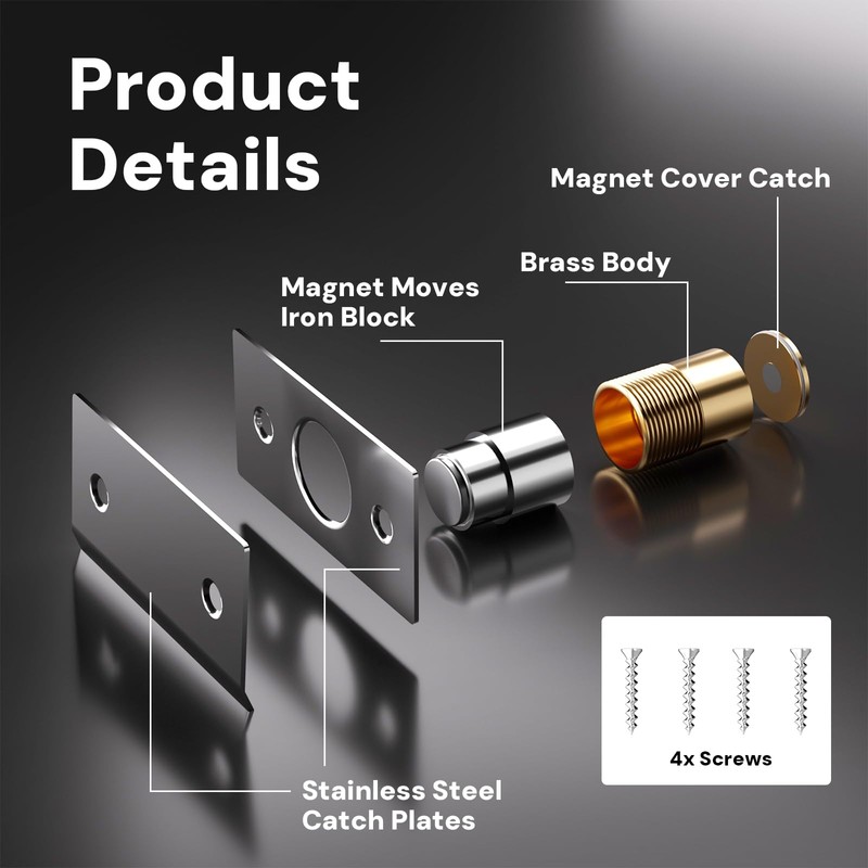 - 5. Size & Package: The dimensions of the magnetic panel (2.1" x 1"), brass body (0.9" x 0.7"). Impact plate included. Package completes 4 magnetic latches + screws. Measure before drilling for perfect alignment.