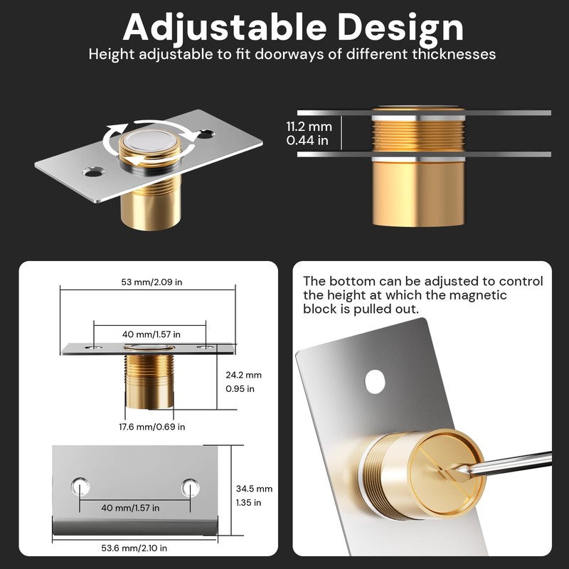 - 3. Adjustable double design for perfect fit: length adjustment, rotate the brass lock nut to customize the distance from the magnet plate to the beat, adapting to different door thicknesses. Magnetic tension control, adjust the shrinkage depth through the copper base for a smooth and secure closure every time.