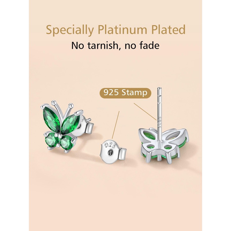 FindChic Sterling Silver Butterfly Earrings for Women May Birthstone Bling Simulated Emerald Hypoallergenic Tiny Stud Earrings Gift for Her