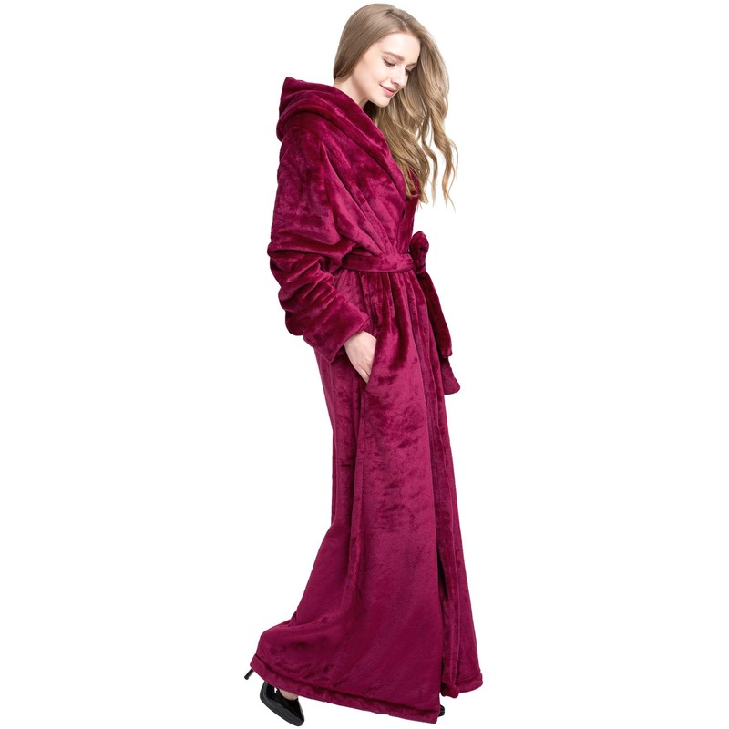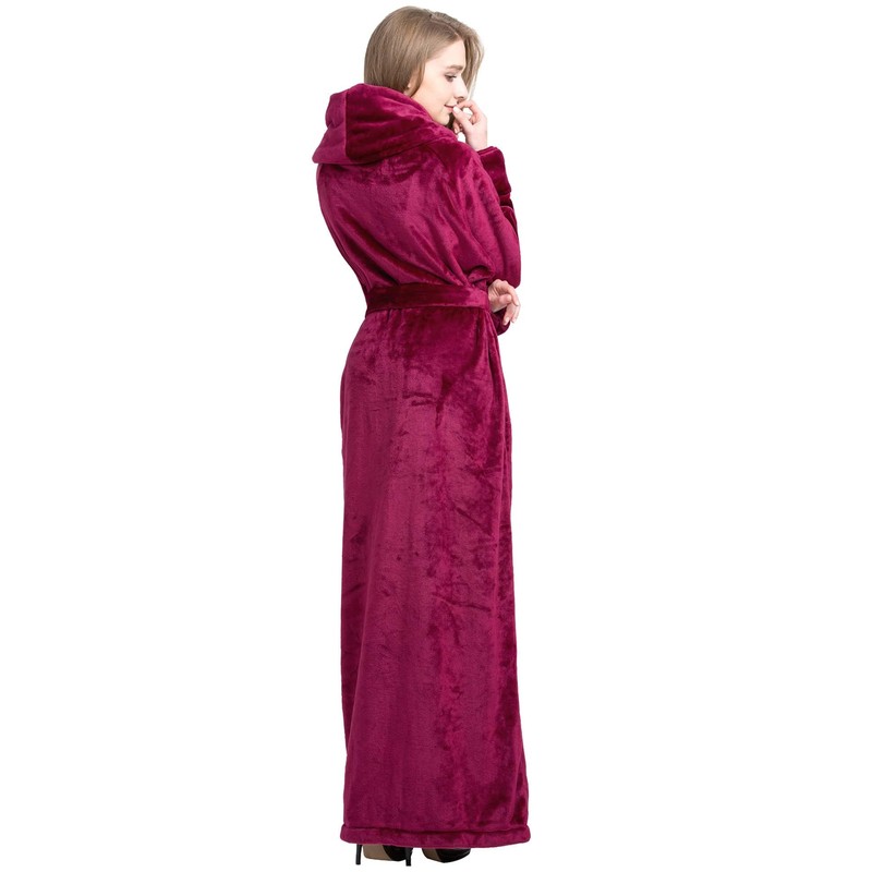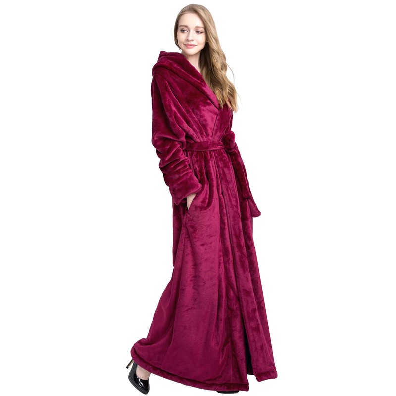 FindDress Women's Plush Robe Extra Long Robe with Pockets Thicken Soft Warm Bathrobe DarkRed S