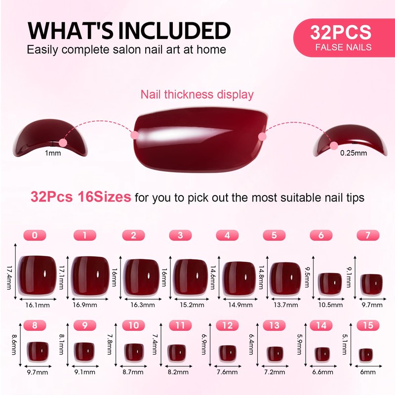 - Include(32 Nails in 16 Sizes) - Various nail sizes ensure a totally custom fit, each set comes complete with a storage box, nail glue, adhesive tabs, double-sided nail file, cuticle stick, and prep pad.