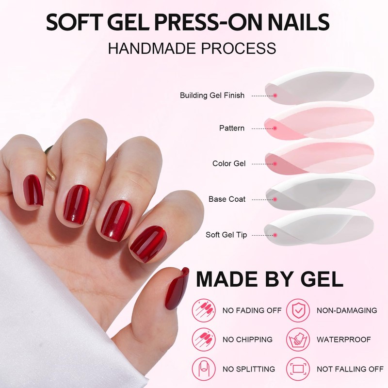 Findigit Short Red Fake Press On Nails - Cat Eye Square Stick On Nails with Nail Glue, Reusable Soft Gel Glue On Nails Kit Fit Natural False Nails for Women 16 Sizes - 32 Nail Kits, Square Ruby Red