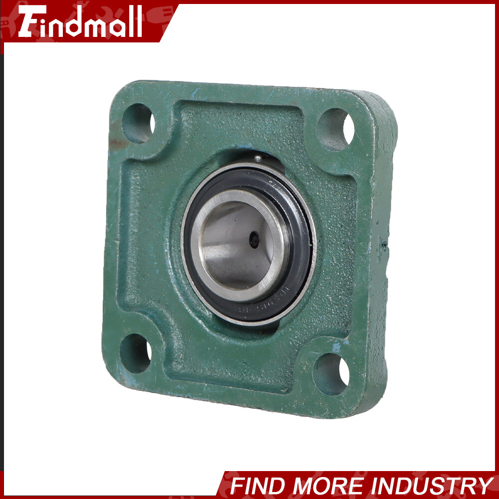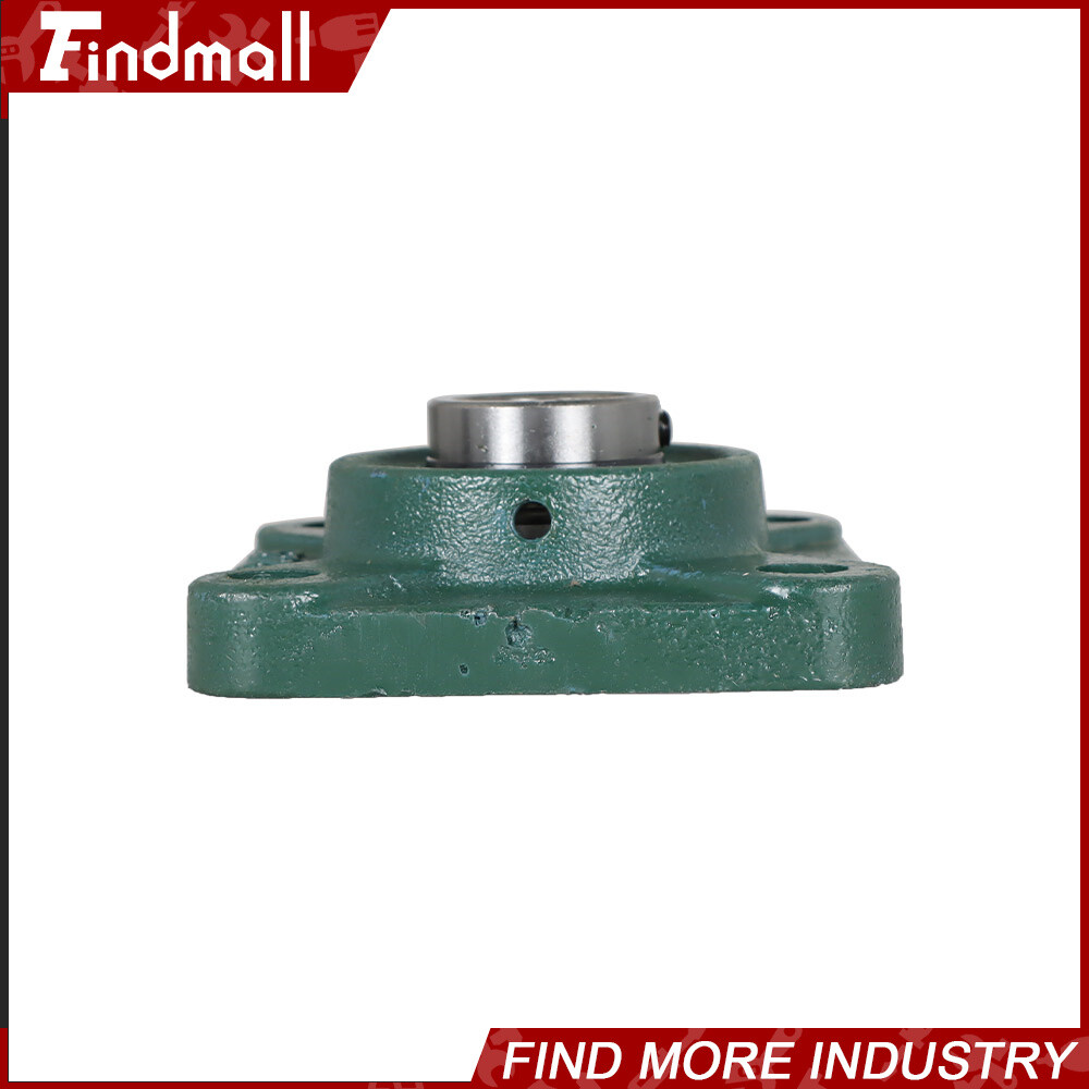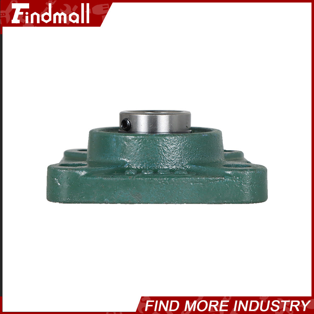 The UCF pillow block mounted bearing series has four bolt holes, and a set screw lock is designed for mounting onto bearing surfaces parallel to the shaft axis, such as conveyor belts.  This ready-to-mount unit has solid base cast iron housing, chrome steel bearings, and is designed for efficient operation at a wide range of speeds.  This one-piece pillow block housing allows for a stationary outer ring and rotating inner ring.  Insert bearing maintains the separation between moving parts to reduce rotational friction, and to support radial and axial loads.  The bearing is secured to the shaft with set screws to prevent slippage.  This mounted bearing is used in food and beverage manufacturing, textile industry and many other industrial manufacturing.