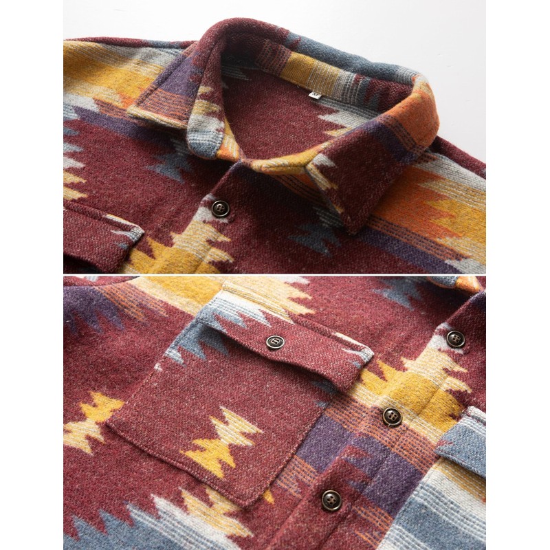 - Lightweight lapel collar long-sleeved ethnic Aztec jacket shacket woolen coat, pair with tee shirt, pullover, sweater, jeans, wide leg pants, overall, flats, sneakers for a chic look