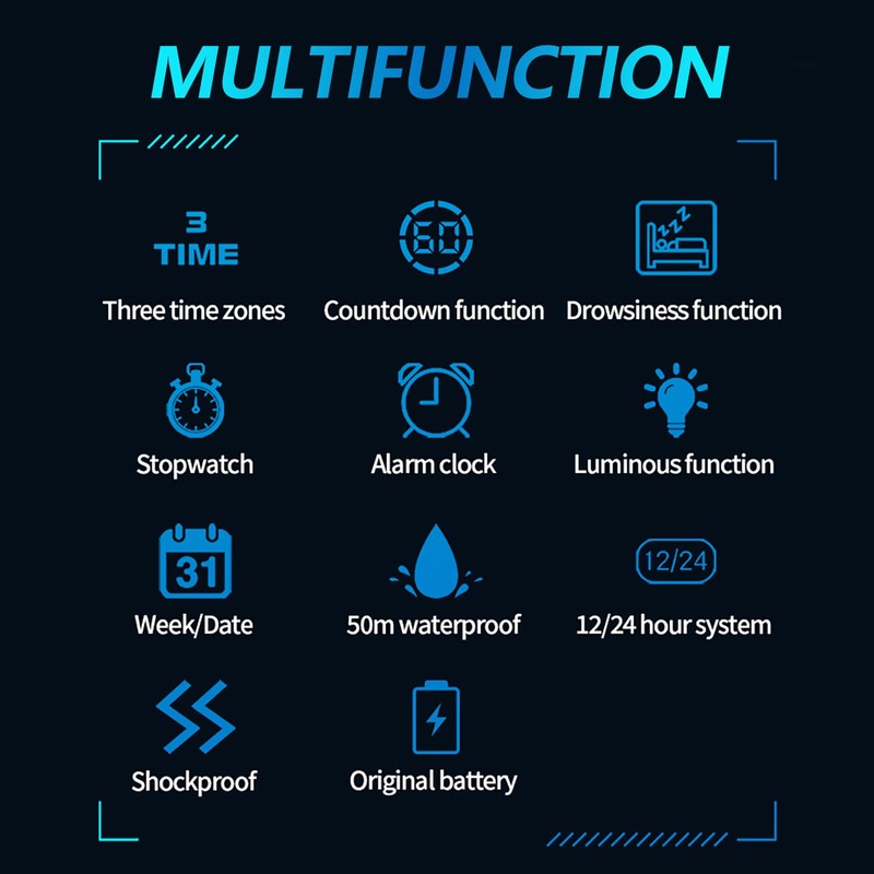 - Sports Watches for Men : multiple functions watch for men,5ATM Waterproof/LED Backlight/Shockproof/Stopwatch/Calendar/12-24H Display/3 Time Display/Alarm,etc