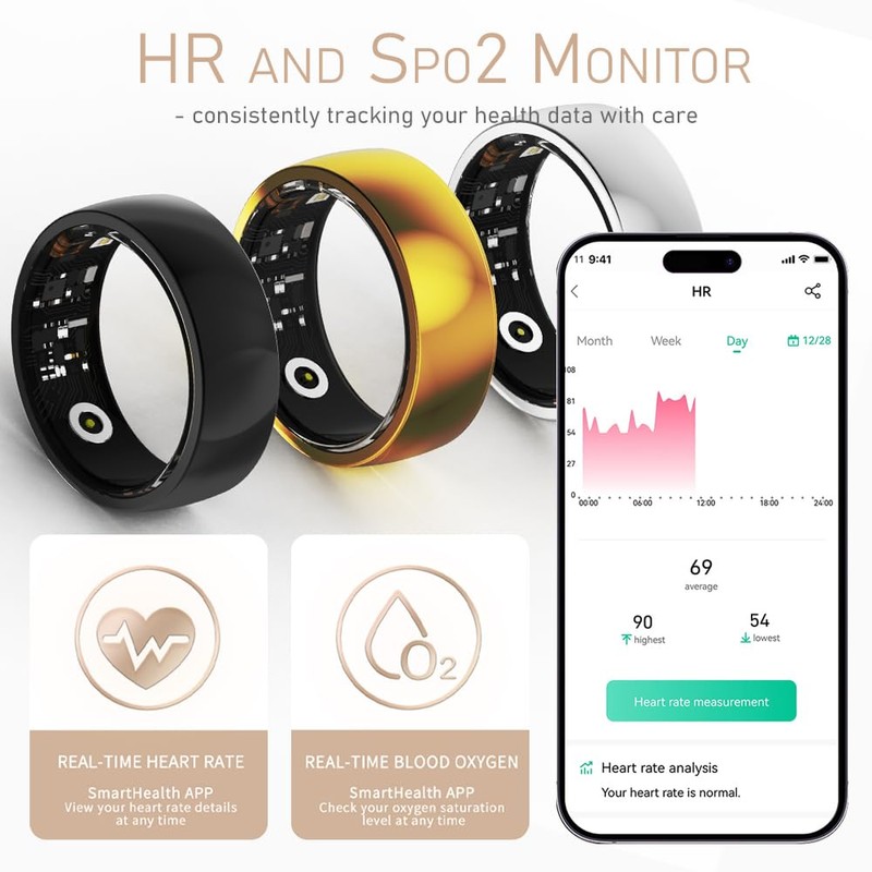 - HEALTH MONITOR This smart ring uses optical sensors technology to monitor heart rate, blood pressure and oxygen saturation in the blood to provide you with intuitive data support for your health. At night, when you activate sleep monitoring mode, the built-in gravity sensor in the ring estimates your sleep time based on your movement frequency and provides you with sleep quality feedback that can serve as a reference.