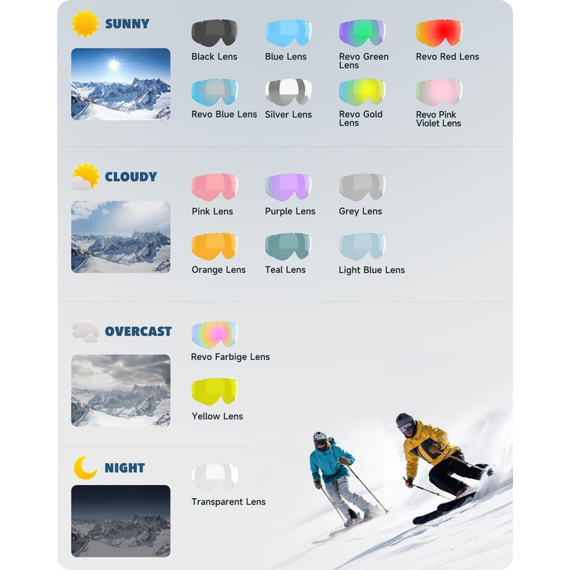 - Dual layer lens + anti-fog coated inner lens design: bring a fog-free skiing experience, 100% UV400 protection, anti-scratch, anti-fog, anti-impact is more robust and durable than other ski goggles.