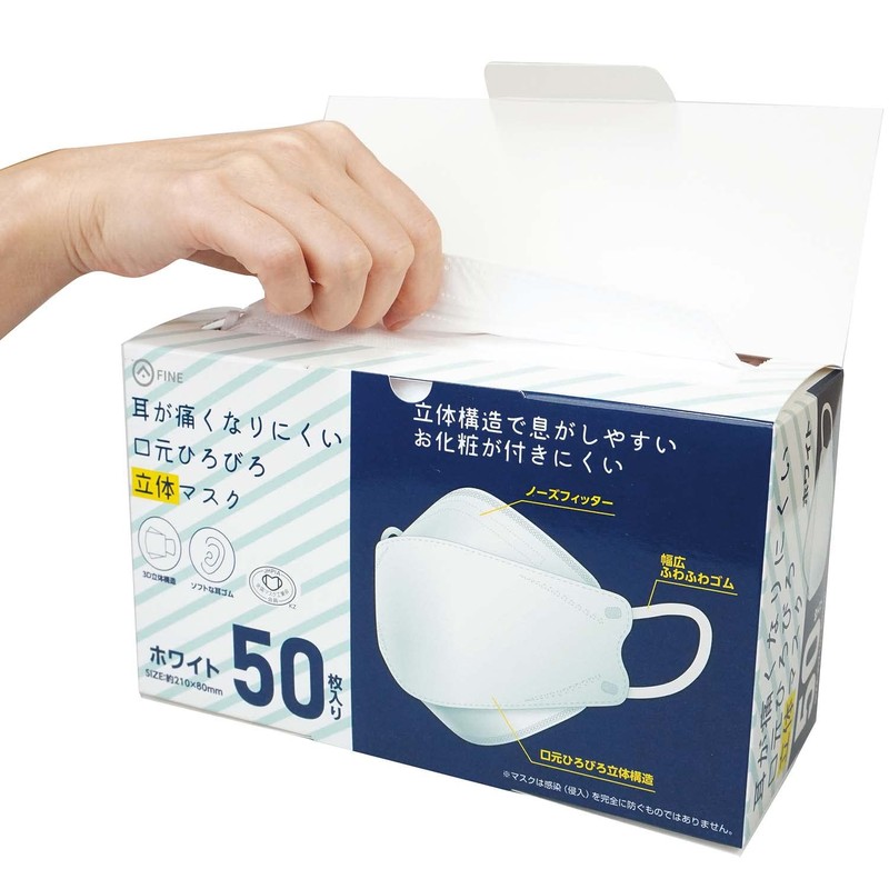 Fine FIN-1053WH Hard to Hurt Your Ears, Wide Mouth, 3D Mask, Easy to Breathe, Non-woven Fabric, 50 Pieces, Large Capacity, 8.3 x 3.1 inches (21 x 8 cm), White