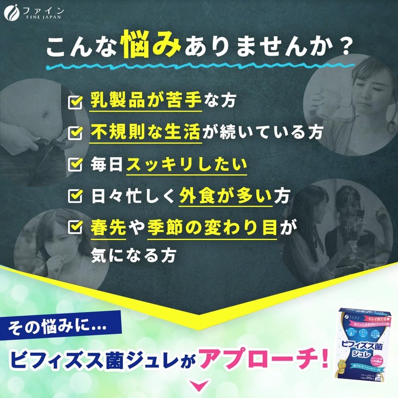 - 本品は善玉菌であるビフィズス菌を主成分に、ビタミンCやオリゴ糖など女性に嬉しい美容成分が美味しく摂れるジュレです。●ヨーグルトテイストですっきり爽やかなおいしさです。●1包でヨーグルト1食分(約100g)の約5倍のビフィズス菌数を摂取できます。(ビフィズス菌配合の市販ヨーグルトと比較)
