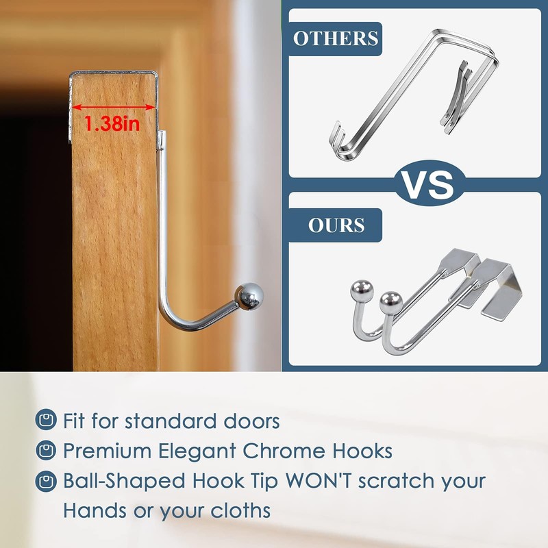 - 【2 Wide Metal Hooks】- The 1.38” wide over door hooks are specially designed with BALL SHAPED HOOK TIPS avoiding any scratching of clothes or fingers. - Premium THICKNESS & WIDTH ensure the hooks hang stably on door. Never deform, slide out of place or scratch your door easily like those cheaper hooks.