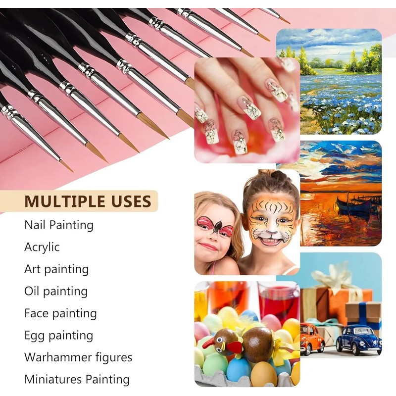 • Detail paint brushes: 12 Different Sizes Brushes shape and number stamped on to help budding artists select the right brush. Mini tip paint brushes allow you to do fine detailing and art painting, precisely reaching tight little gaps or tiny points. Whether you're a beginner, hobbyist or a professional, this artist paint brushes will help you make excellent work of art.