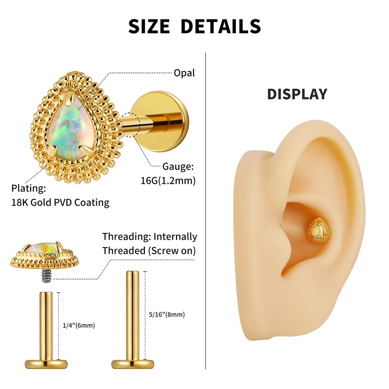 • 2. [ Suitable Location ]: Guage: 16G=1.2mm; Length: 5/16"=8mm & 1/4"=6mm. Threading: Internally threaded screw-on. Suitable for Cartilage, Tragus, Conch, Helix, Flat, Lobe.