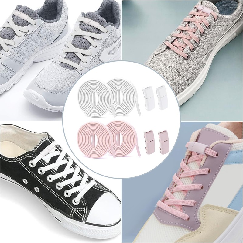 FINEASY 2 Pairs No Tie Shoe Laces 110cm Elastic Laces for Trainers, No Tie Elastic Shoelaces with Magnetic Buckles, Shoelace Apply to Sneakers, Casual Shoes, Board Shoes, White & Pink