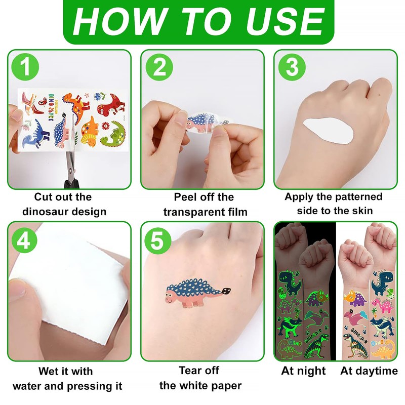 - Luminous dinosaur tattoo stickers: the dinosaur tattoo stickers glow in the dark and bring energy and fun to children's parties. As they are made from safe and non-toxic materials, parents can be sure that their children will have fun with these glow in the dark tattoos.
