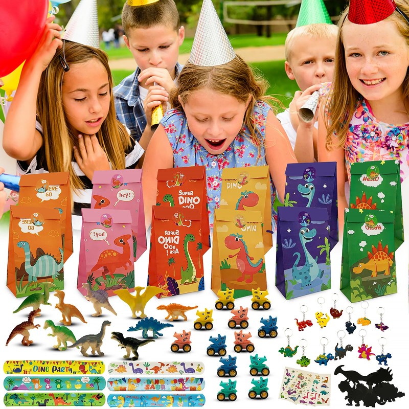 - Dinosaur party bag children's birthday: dinosaur party favour set contains 12 dinosaur scratch picture craft art set, 12 mini dinosaur figures, 12 dinosaur key rings, 12 dinosaur gossip bracelets, 12 dinosaur gift bags, 10 luminous dinosaur tattoo stickers, 12 pull back dinosaur car toys. This set contains a variety of surprises that will give your child and friends indelible memories.