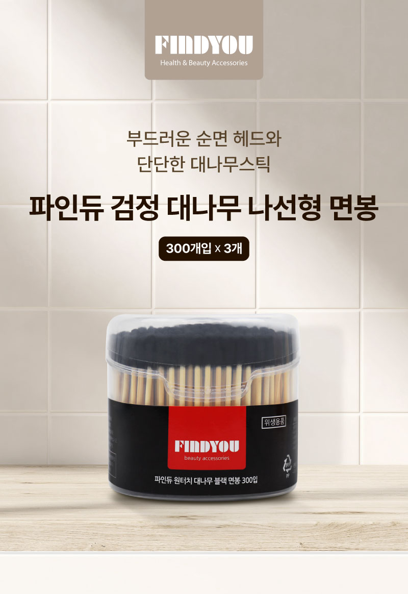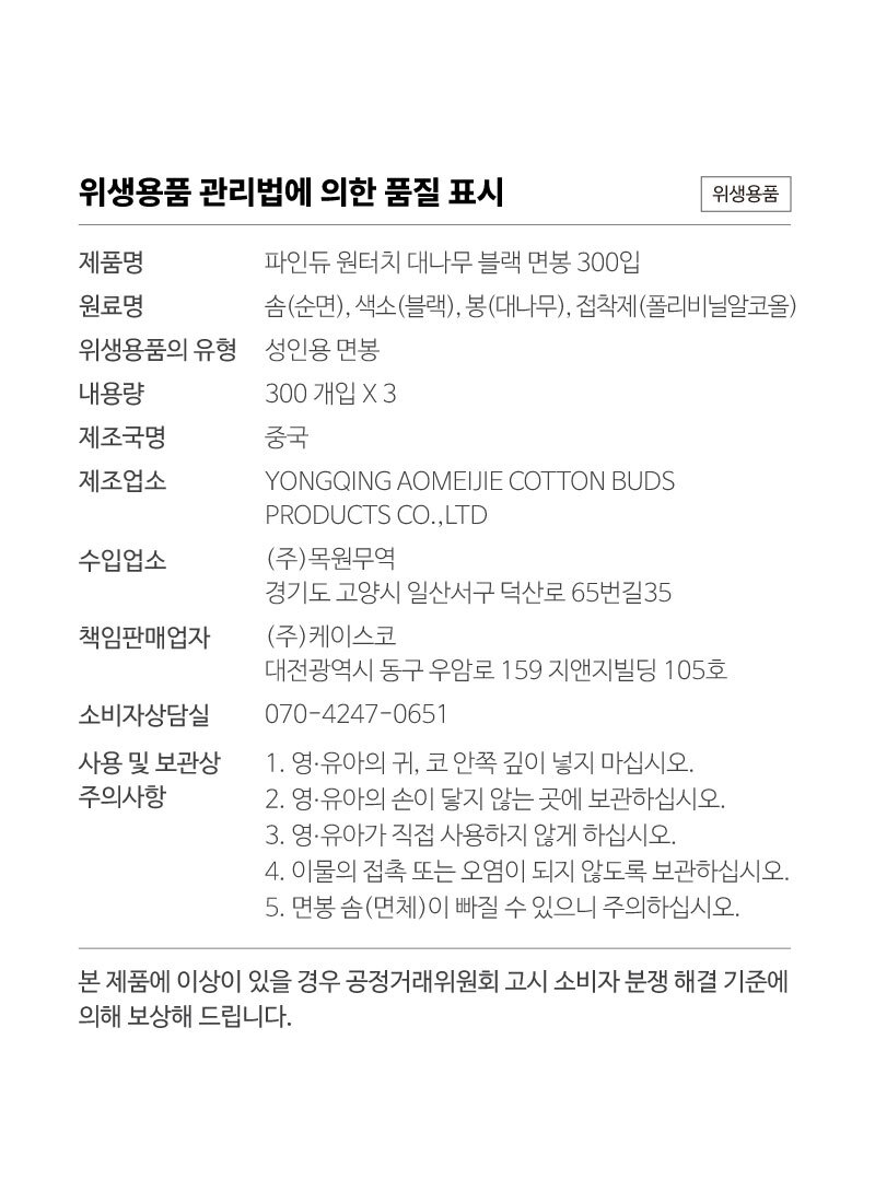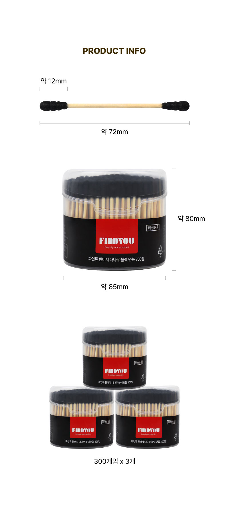 파인듀 검정 면봉 천연솜 대나무 300개입x3개