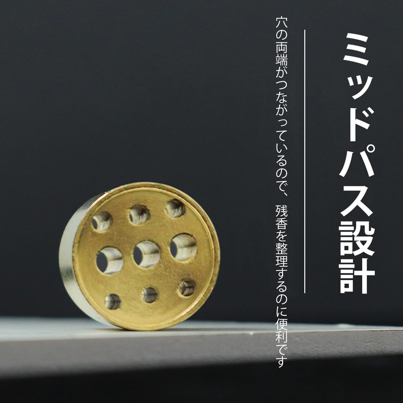 【貫通設計】3mm/2.5mm/2mm(1.5mm 含む)の 3 種類サイズの差込穴を備え、太さの異なる各種線香に対応可能。且つ穴は両端貫通設計で、燃え残りの線香を取り出す時に手間が省け、使い勝手を大幅アップ。