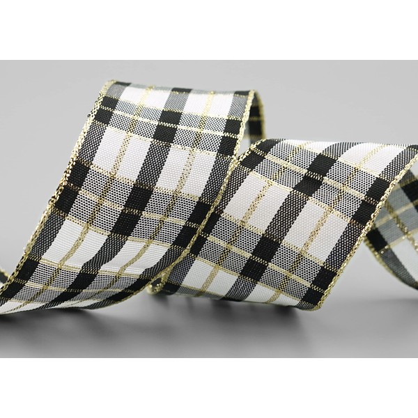 finemark 20 m x 40 mm Checked Christmas Ribbon Black Grey Gold (113) White with Lurex Wired Edge Ribbon Decorative Ribbon Gift Ribbon Tartan Shiny Ribbon Gold Edge Wire Ribbon Winter Christmas Check