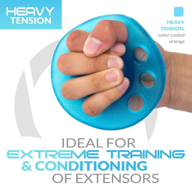 • 3 TENSION Avaiable. Light Tension, color coded pink, ideal for starters or rehab. Medium tension, color coded orange, ideal for maintenance of already strong hands and Heavy tension, color coded blue, for extreme training and conditioning of extensors.