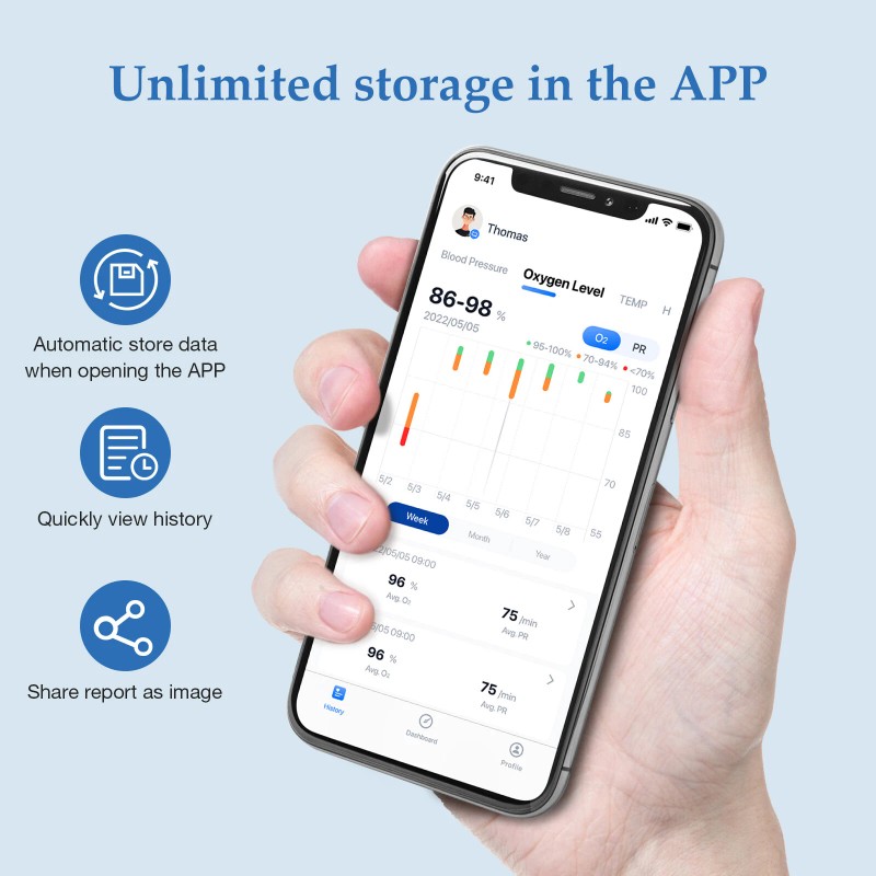 The newly upgraded Pod-2W pulse oximeter inherits the functions of the old version and adds a new Bluetooth function. It can not only measure your blood oxygen saturation and pulse rate for you accurately, but also records measurement data on our free app, allows you review your historical data all the time, to understand your body better. | |||