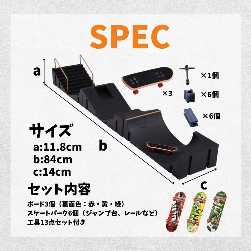 Board Size: Approx. 3.9 x 1.1 inches (9.9 x 2.9 cm); Set Contents: 6 types of skate parks, 3 finger skateboards, 13 connecting tools; Recommended Age: 15 years and up; Material: ABS plastic, alloy parts.