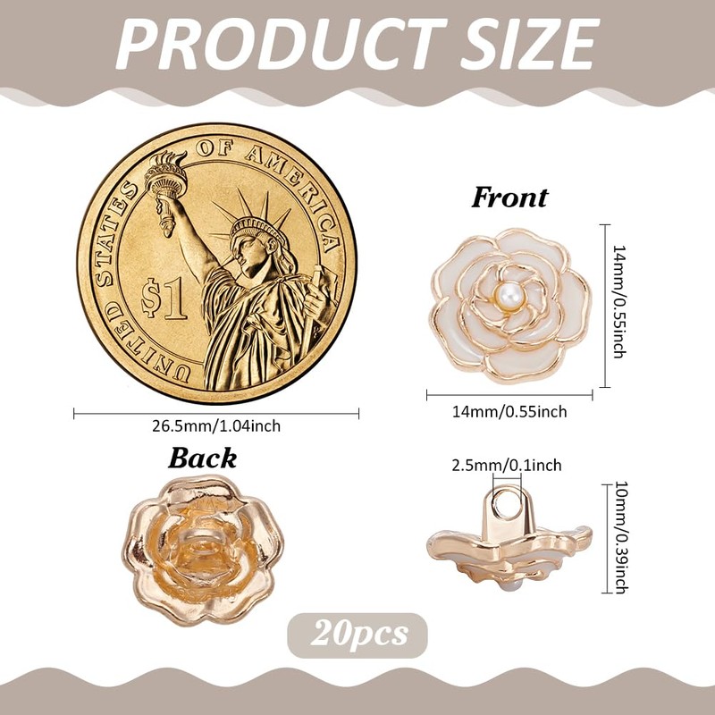 - 20 Rose Buttons: You will receive a package including 20 beautiful rose flower buttons. Each of the button is rose flower shape and every button has a small pearl at the place of stamen. The rose buttons have snow white color as main color and each rose petal is edged in light gold.