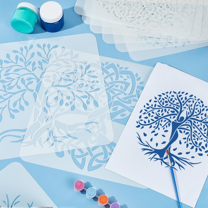FINGERINSPIRE 9 Pcs Trees of Life Painting Large Stencil 11.8x11.8" Celtic Tree Spiral Tree Twisted Tree Spraying Big Stencil Reusable Tree Branch and Leaves Wall Stencil Vibrant Trees Man Stencil