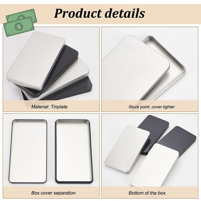 - Package includes: you will receive 4 pieces tin plate cash box in 2 colors: black and platinum, 2 pieces/color. The black and platinum metal design exudes elegance, making it not only a practical storage solution, but also a stylish home decoration.