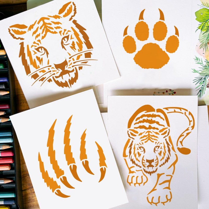 - Tiger Pattern Our animal theme template has a tiger pattern. There is a tiger head, a walking tiger, a tiger claw and a tiger paw print. You can use this stencil to create DIY work at home.